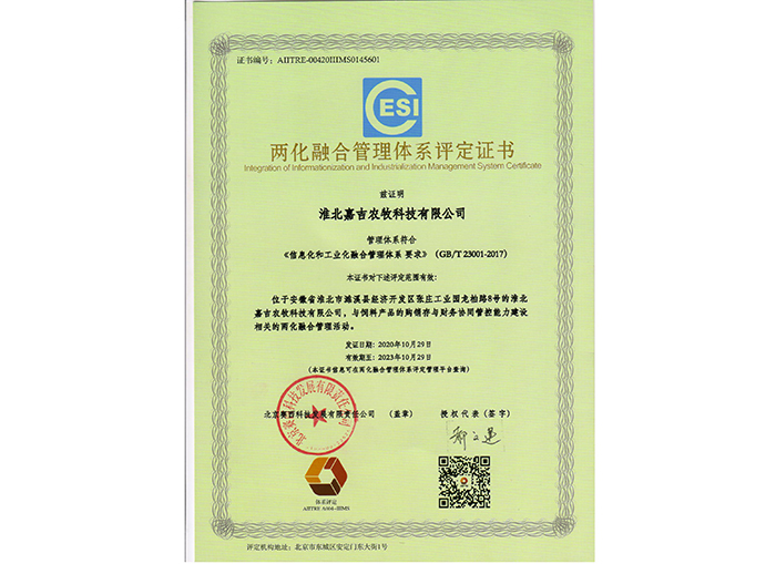 兩化融合管理體系評定證書